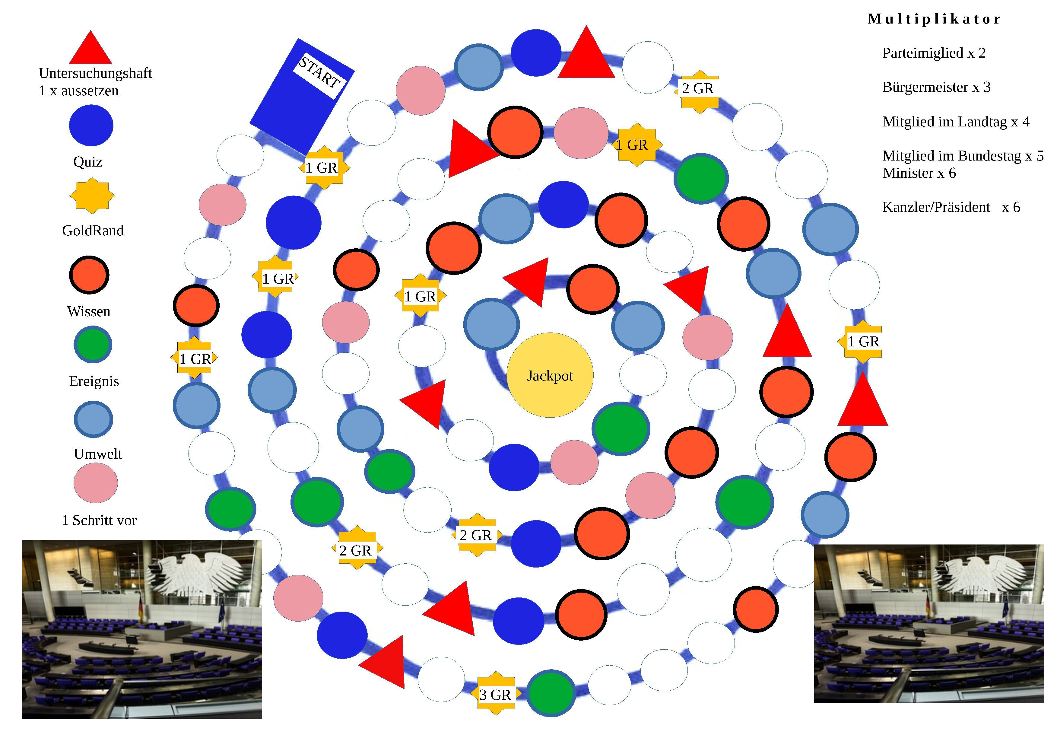 bei dem Brettspiel durch verschiedenfarbige Felder ausgelöst.